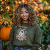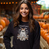 Embrace ghostly glamour with this bewitchingly beautiful design featuring a lace-veiled ghost, satin bronze bow, cobweb wings, and vintage florals. This isn’t your average Halloween sweatshirt—it's Haunt Couture. A fun, trendy pick for Halloween lovers who like their ghosts with a touch of style. Perfect for fall vibes, pumpkin patches, and ghostly hangs. Size chart is in photos.