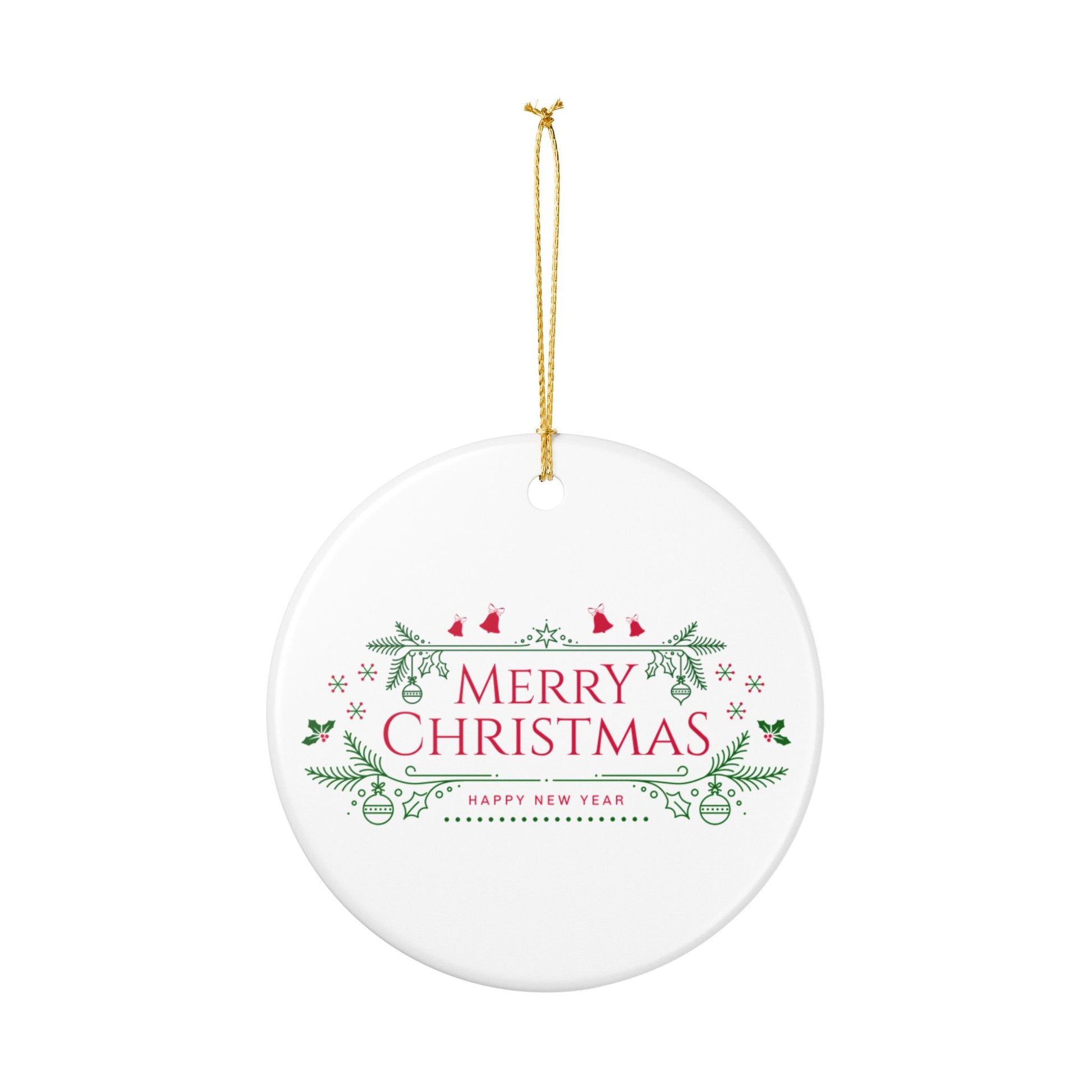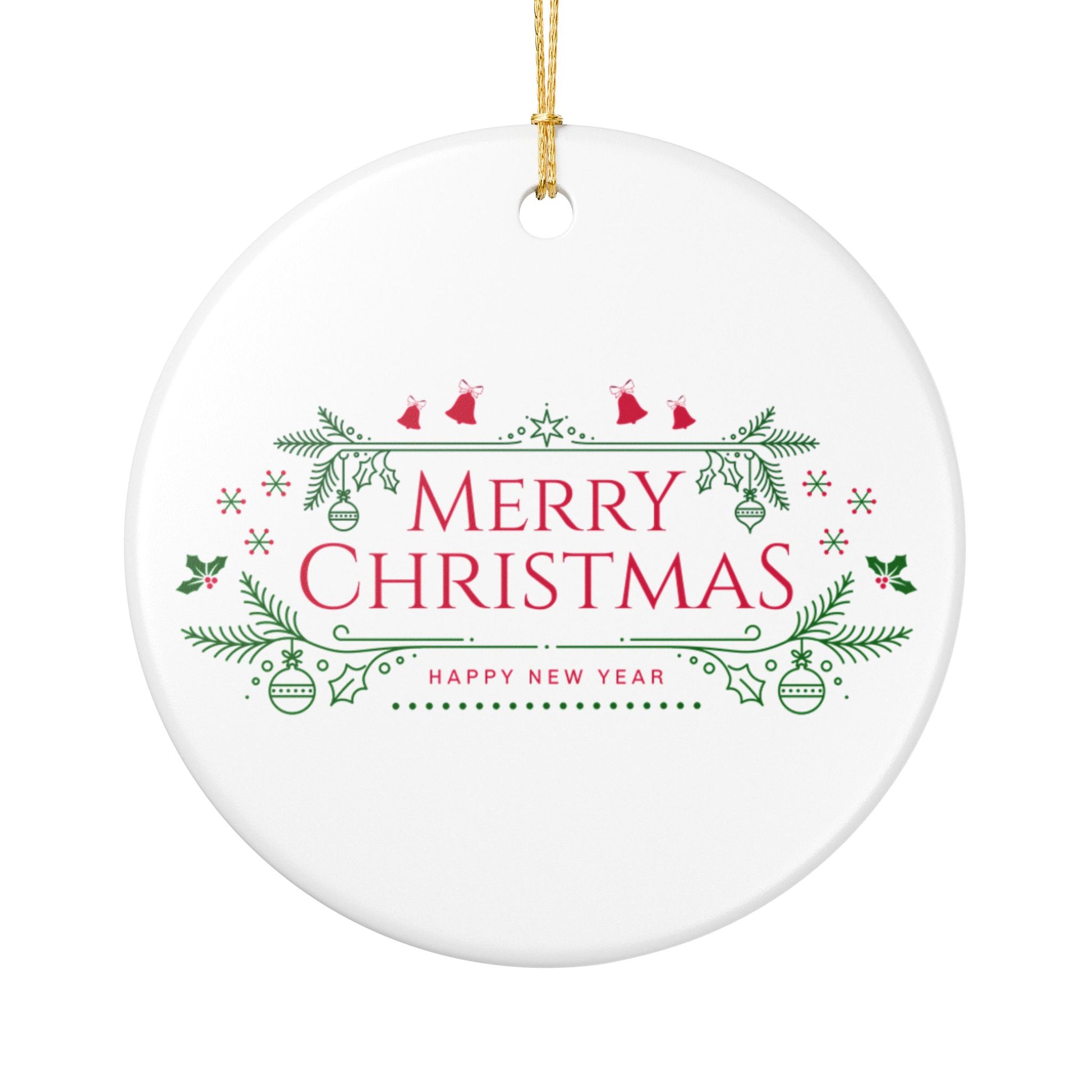 Add timeless holiday charm with this Merry Christmas & Happy New Year Ornament featuring festive bells, holly, ornaments, and greenery in classic red and green. Perfect for celebrating the season or gifting joy to loved ones.